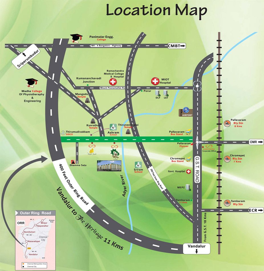Chromepet near GST road, is a mixed residential township with busy commercial high streets bustling with commercial activities, and is easily commuted to major IT and industrial hubs like MEPZ, IT corridors off OMR, Mahindra world city, SIDCO, Schools, Colleges & hospitals